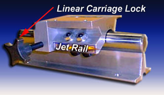 According to the company, all metal construction and a unique center locking feature make the Linear Carriage Lock a durable product that will provide years of dependable service. The lock centers itself evenly onto the shaft and there is no undue pressure placed on the bearing when locking to the shaft. When the thumb wheel is tightened, brass inserts contact the shaft from both sides to prevent marring and abrasions. Most other designs tighten from one side only, putting pressure against the opposite side of the bearing, pulling it against the shaft and possibly damaging the shaft or bearing. |